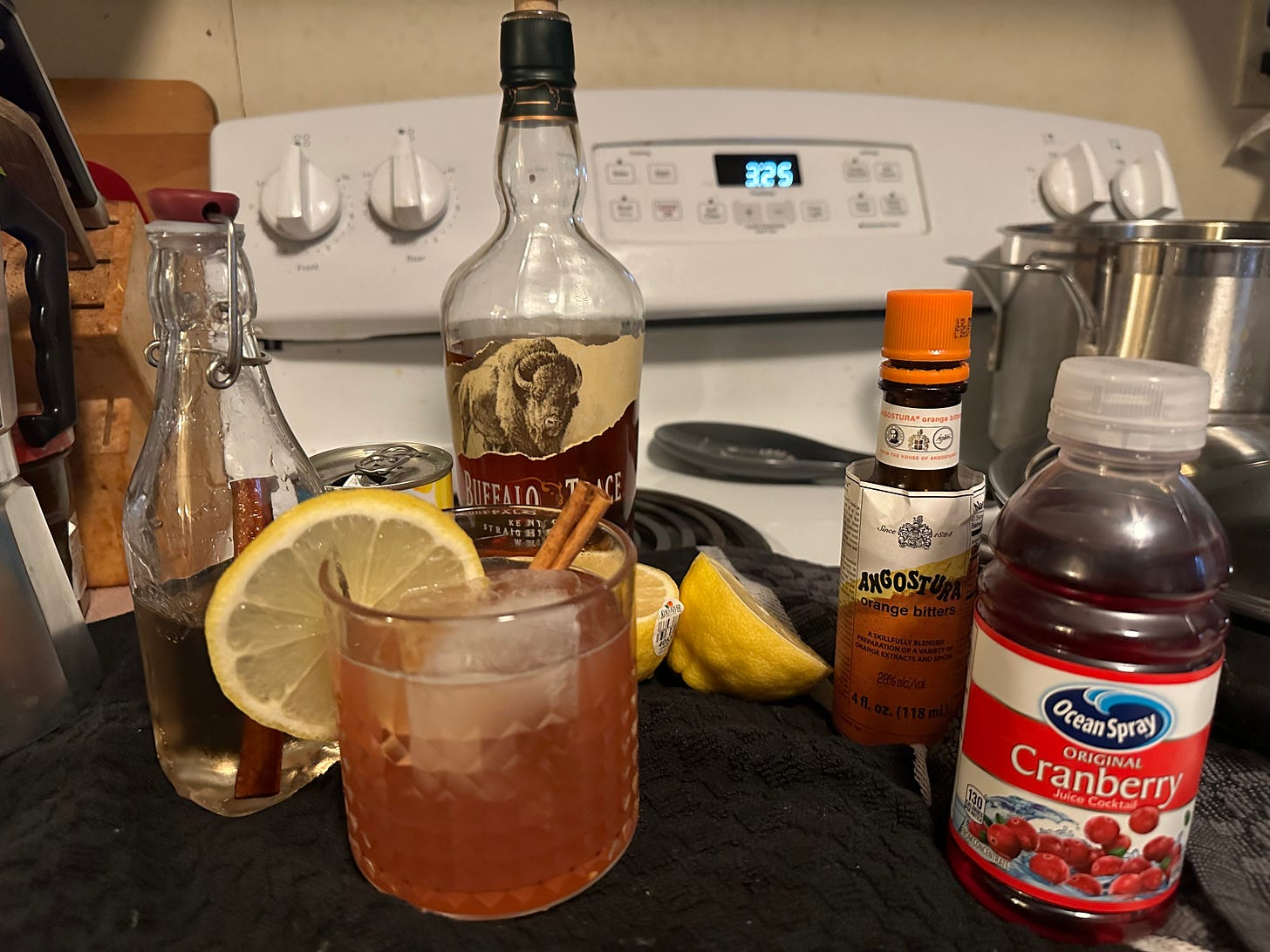 When I started planning the cocktail, I had envisioned a cranberry margarita. But then my friend at the liquor store hooked me up with some Buffalo Trace, which is as rare as hen’s teeth here in Ohio. I couldn’t pass that up. The distillery that makes Buffalo Trace produces Pappy Van Winkle — a holy grail among bourbon fans. Bourbon hunters are desperate to snatch up anything from the Buffalo Trace distillery, even this very nice but not impressive core product from their line. I paid about $20, which is what it’s actually worth. Resellers will cheerfully double the price for a bottle of Buffalo Trace online. It’s completely out of hand. (I once offered to sell the cardboard box a case of Buffalo Trace came in to a customer for $5. He seriously considered it.)